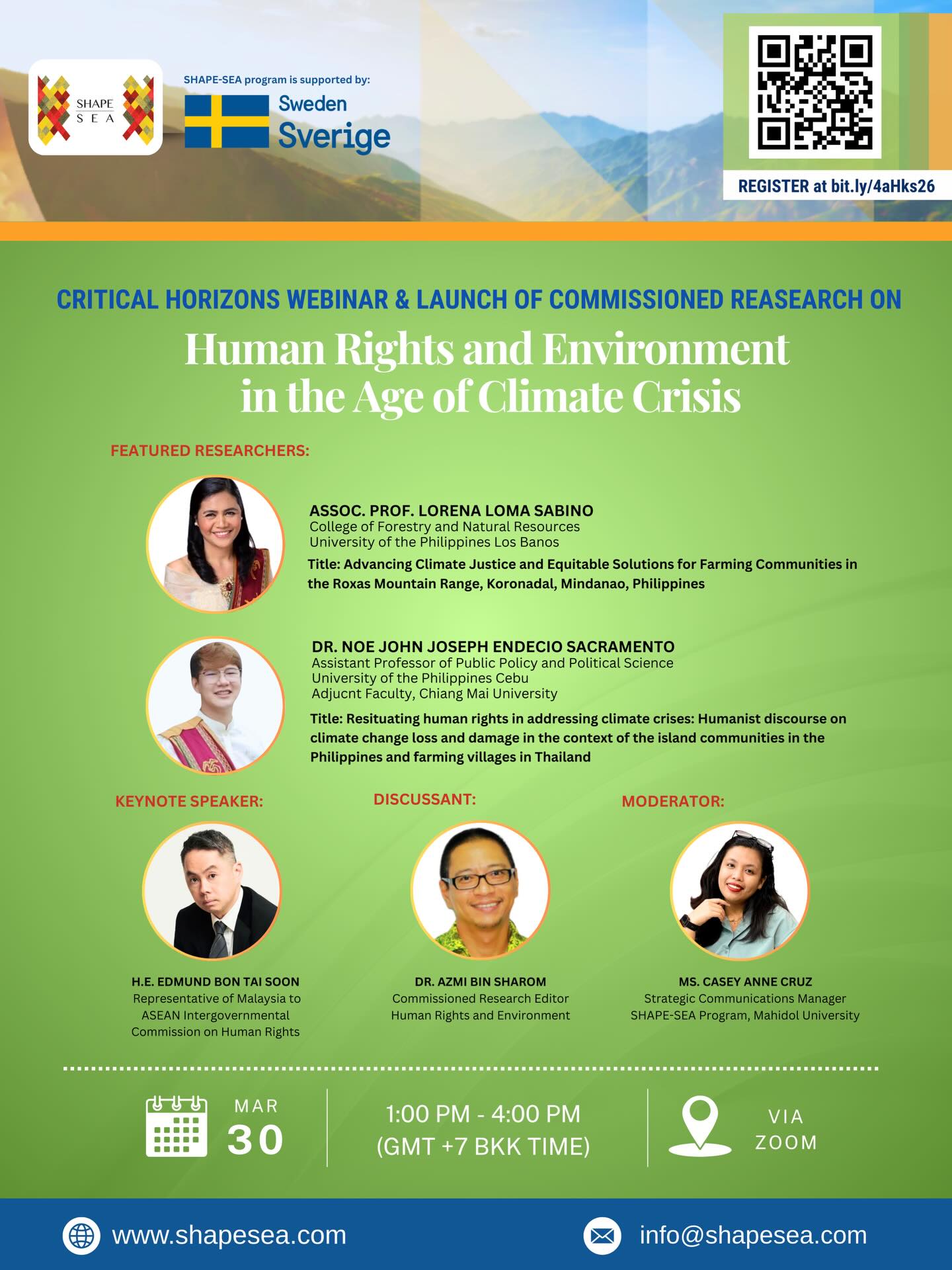 As part of the Commissioned Research Project on Human Rights and Environment in Southeast Asia, SHAPE-SEA brings together scholarly contributions that examine these intersections from grounded, community-based perspectives. This webinar, part of the Critical Horizons Series, marks the official launch of the commissioned research volume. While the volume addresses a broader range of issues at the intersection of human rights and the environment, this session curates selected chapters that foreground the climate crisis, justice, and accountability as urgent regional priorities.