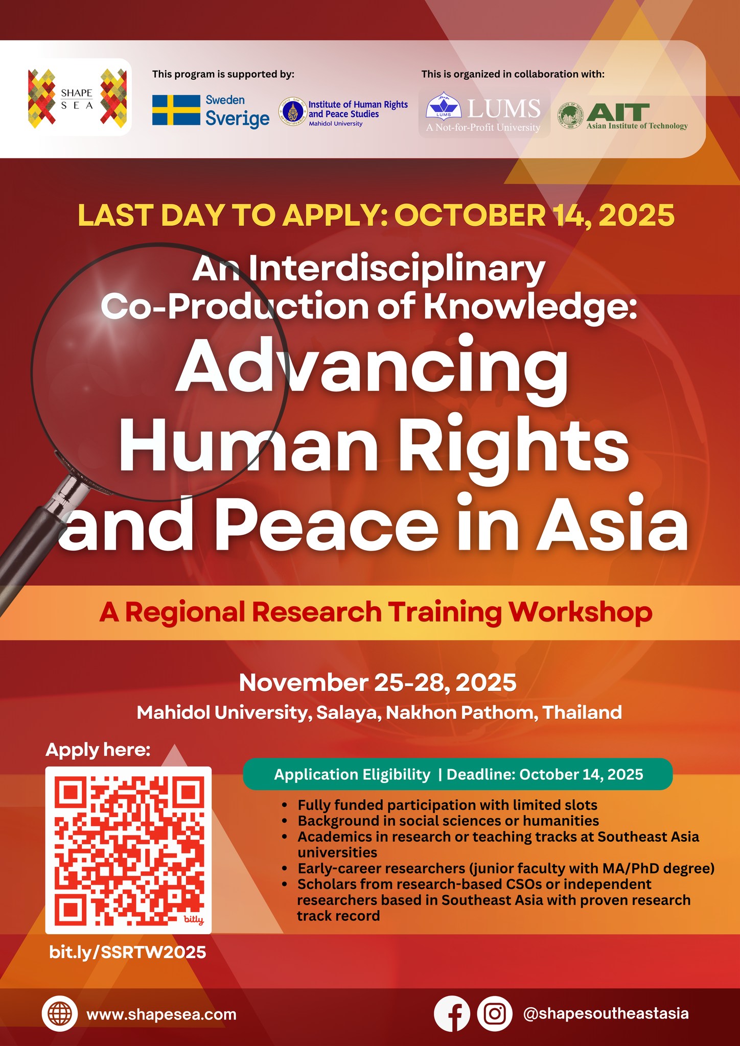 From 25–28 November 2025, SHAPE-SEA is proud to host the Regional Research Training Workshop titled: “An Interdisciplinary Co-Production of Knowledge: Advancing Human Rights and Peace in Asia.”