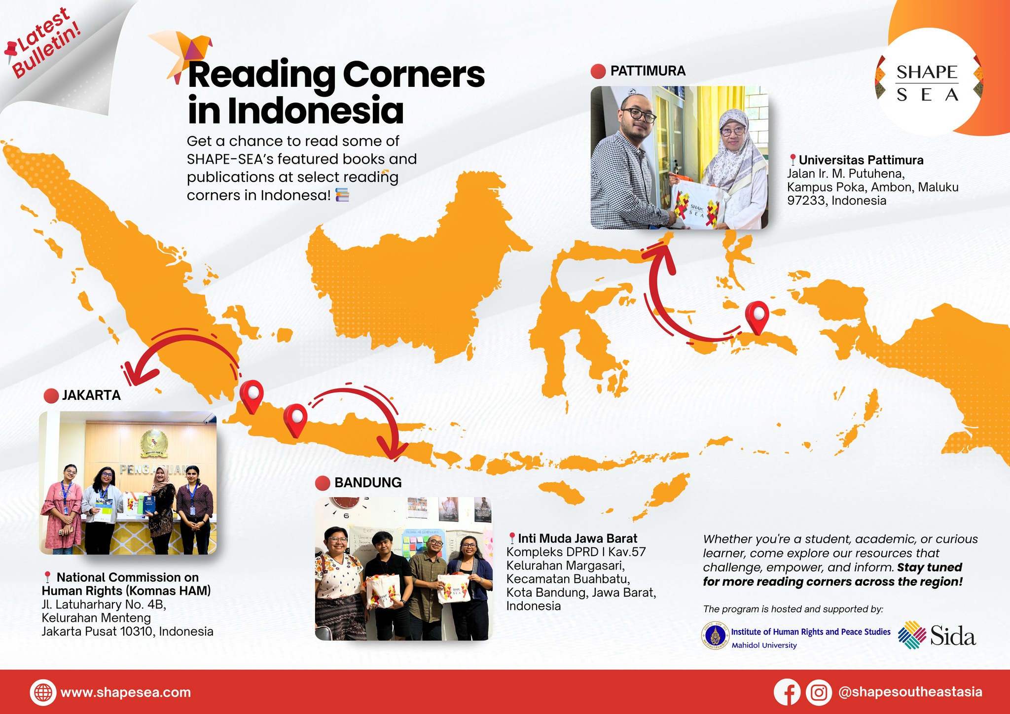 We’re thrilled to announce that SHAPE-SEA and Southeast Asian Human Rights and Peace Studies Network (SEAHRN) featured books and publications are now available at select Reading Corners in Indonesia! ![]()